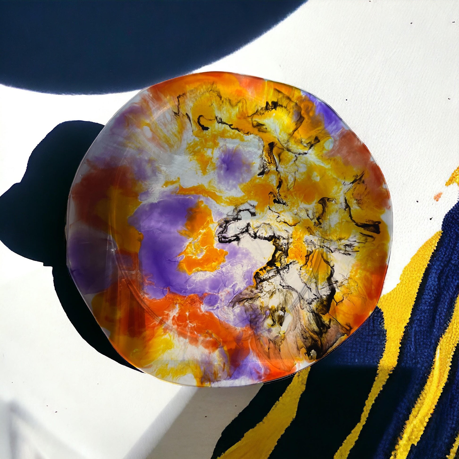 Ajoutez une explosion de couleur à votre espace avec notre plateau en résine à la forme arrondie, arborant une palette vibrante de jaune orangé et de violet. D'une taille généreuse avec un diamètre de 45 centimètres, ce plateau apporte une énergie artistique et une fonctionnalité élégante à votre quotidien.
